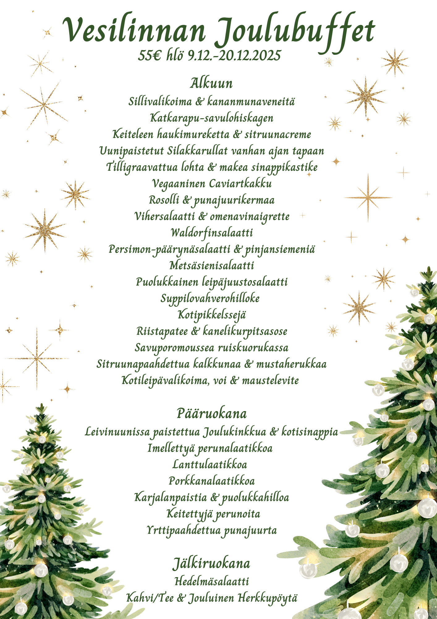 Vesilinnan lounas Jyväskylässä on suunniteltu niin, että se sopii niin kiireiseen työpäivään kuin rauhalliseen tapaamiseen ystävien kanssa. Lounasmenu vaihtuu sesongin mukaan ja sisältää vaihtoehtoja: