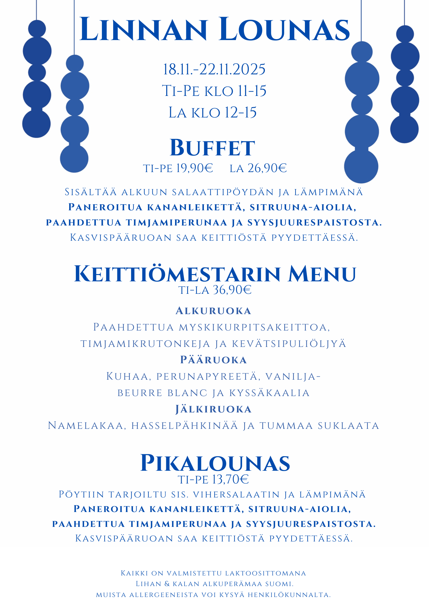 Linnan Lounas on normaalisti tarjolla ti-pe klo 11-15 (16) ja la klo 12-15 (16).